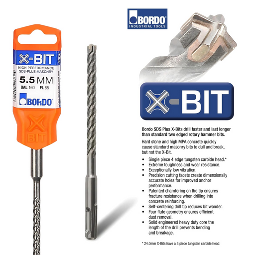 5.5mm x Overall Length/Flute Length SDS Plus X-Bit Masonry Drill Bordo X-Bits drill faster and last longer than standard two edged rotary hammer ...